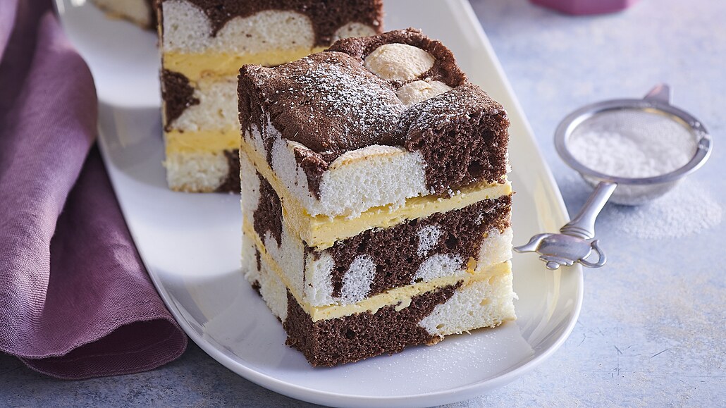 - Vejce vyšleháme s cukrem do husté pěny. Přidáme prosátou mouku s kakaem a kypřicím práškem. Pekáček o rozměru asi 25 x 35 cm vyložíme pečicím papírem a střídavě do něj vrstvíme světlé a kakaové těsto. Pomocí špejle vytvoříme mramorování, pečeme v troubě vyhřáté na 180 °C asi 40 minut. Po upečení necháme krátce vychladnou v pekáčku a pak pomocí papíru vyndáme. Po úplném vychladnutí korpusy vodorovně rozkrojíme na tři díly.