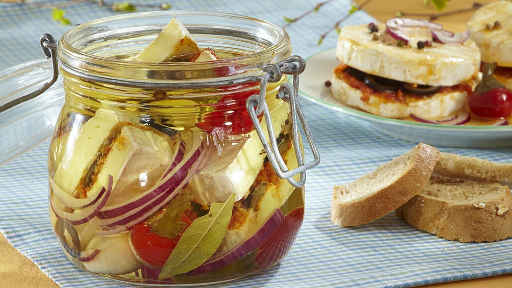 - Hermelíny vložíme do sklenice, přidáme feferonky, zbylou cibuli i olivy, celý pepř a bobkové listy. Nakonec přilijeme olej tak, aby byly hermelíny zcela ponořené. Sýr necháme asi týden v chladu odležet.