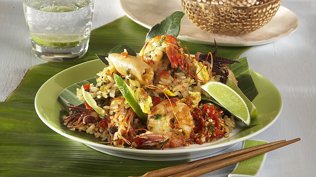 - Přisypeme uvařenou jasmínovou rýži, přilijeme ústřicovou a sladkou indonéskou omáčku a prohřejeme. Podáváme s chilli sambalem (pasta připravená z feferonek, česneku a koriandru) a dozdobíme nakrájenou limetkou. Můžeme servírovat na banánových listech.