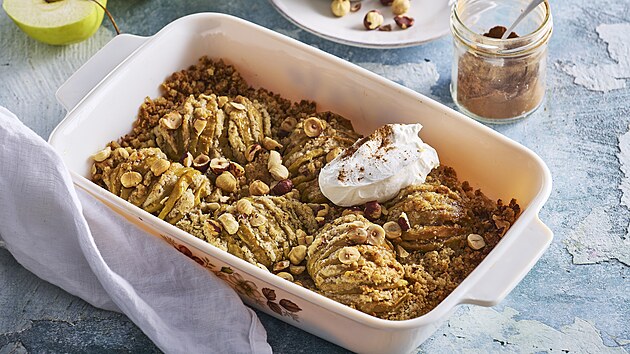 - Jablka rozložíme do pekáčku vymazaného máslem a posypeme je zbylou drobenkou. Před pečením poklademe na povrch plátky másla a posypeme nasekanými zbylými ořechy. Pečeme v předehřáté troubě při 180 °C asi 30 minut. Po upečení podáváme ještě teplé.