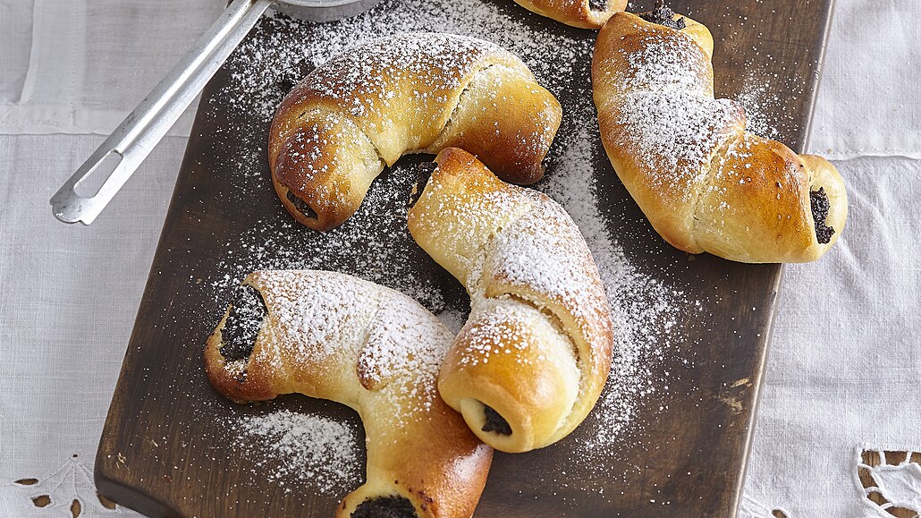 - Vykynuté kuličky rozválíme na oválky, rozetřeme náplň a stočíme do rohlíčků. Na plechu je necháme 20 minut kynout a pak potřeme rozšlehaným vejcem. Pečeme při 180 °C asi 15 minut.
