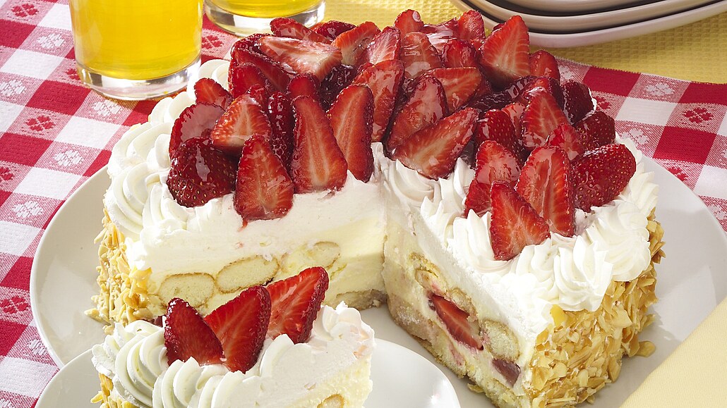 - Vychlazený dort vyjmeme z formy a obalíme kolem dokola v pražených mandlích. Povrch dortu dozdobíme ušlehanou šlehačkou a zbylými čerstvými jahodami.