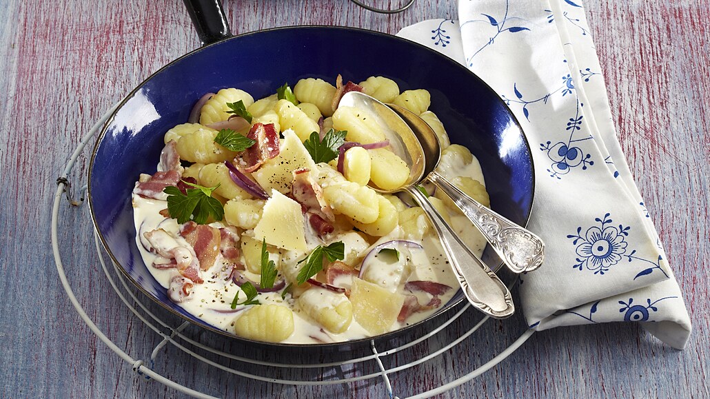 - Necháme omáčku přejít varem a za stálého míchání krátce povaříme do zhoustnutí. Pak vmícháme žloutky a pánev odstavíme. Noky podáváme přelité omáčkou, posypané nasekanou petrželkou a parmazánem.
