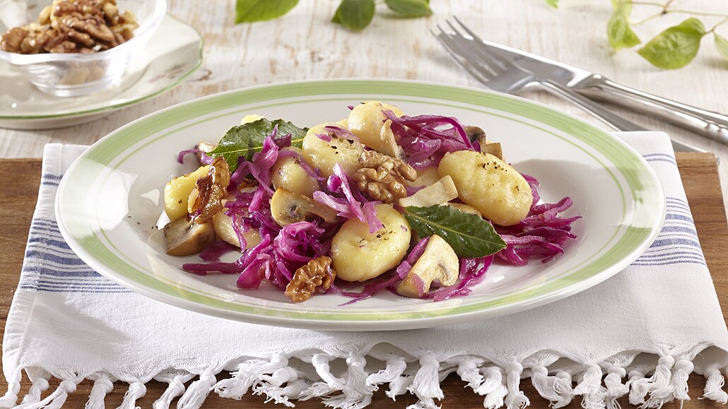- V kastrolu rozehřejeme 2 lžíce oleje a orestujeme na něm cibuli. Přidáme zelí, jablko, jablečnou šťávu a vývar. Směs ochutíme solí a kořením, promícháme a dusíme doměkka. Podle potřeby přiléváme vodu. Nakonec zelí dosolíme, osladíme, okyselíme octem a vmícháme do něj ořechy. Žampiony očistíme, rozčtvrtíme a na zbylém, rozehřátém oleji orestujeme. Přidáme k nim noky se zelím, vše promícháme a prohřejeme.