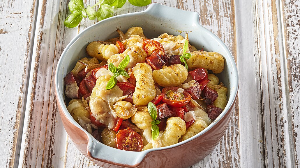 - Vše vložíme do zapékací mísy a posypeme nastrouhaným sýrem. Pečeme ve vyhřáté troubě při 190 °C 10-15 minut. Dozdobíme bazalkou a podáváme.