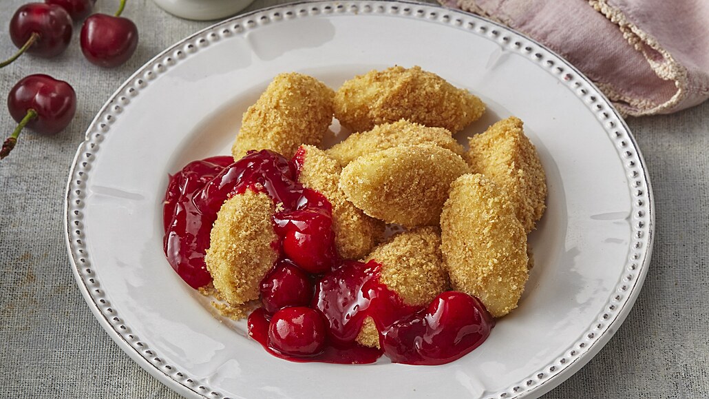 - Třešně nakrojíme, vypeckujeme, dáme je do kastrůlku, přidáme cukr, vanilkový cukr, citronovou šťávu a polovinu vody. Přivedeme k varu, vlijeme solamyl rozmíchaný ve zbylé vodě a krátce povaříme. Noky přelijeme ještě teplou omáčkou a ihned podáváme.