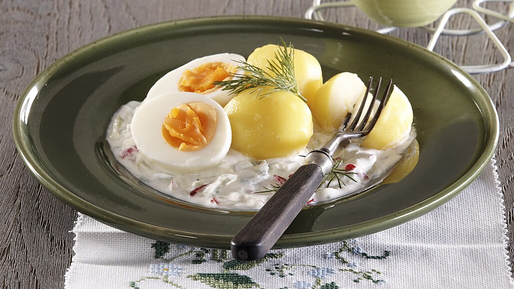 - Brambory oškrábeme a v osolené vodě je uvaříme doměkka. Scedíme je a necháme okapat. Vejce uvaříme natvrdo. Když trochu zchladnou, oloupeme je a rozkrojíme. Brambory a vejce rozdělíme na talíře. Každou porci doplníme tzatziki.