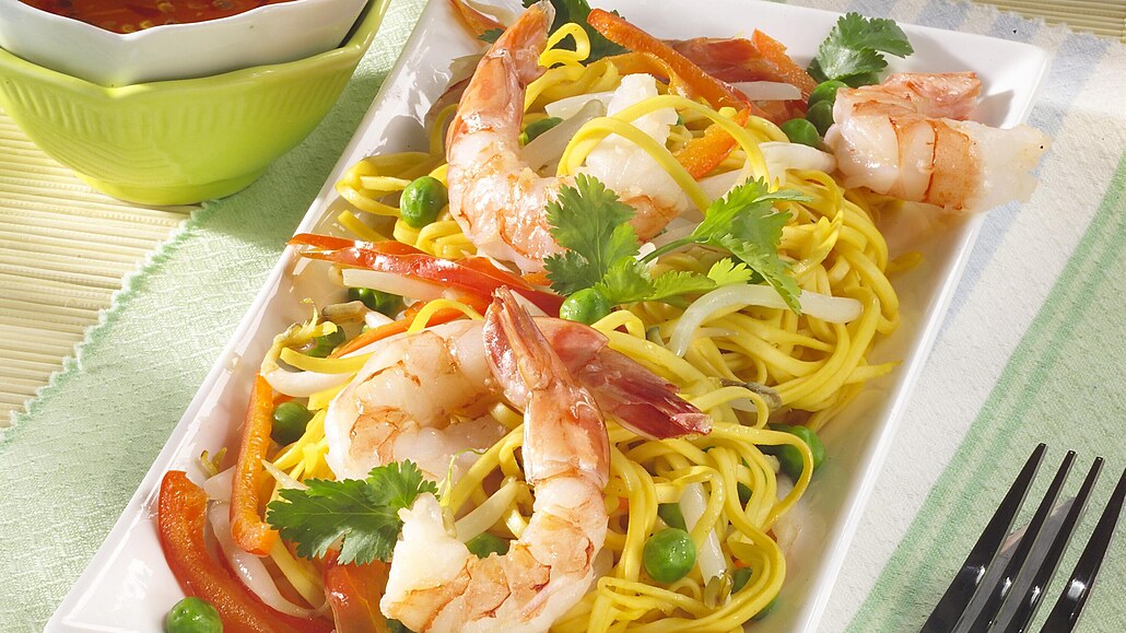 - Připravené nudle s krevetami a zeleninou rozdělíme na talíře a přelijeme sladkou chilli omáčkou.