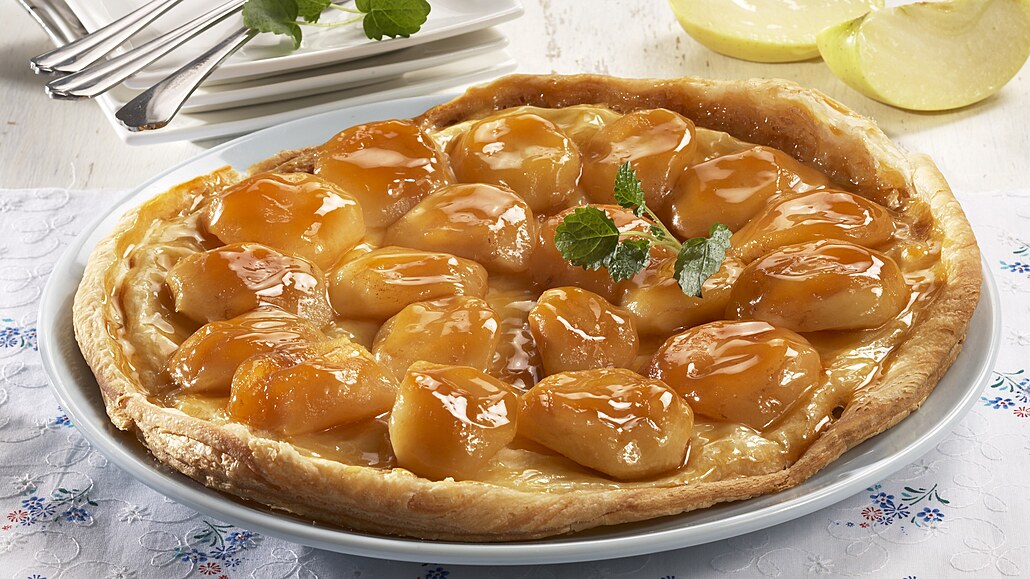 - Jablka oloupeme, nakrájíme na čtvrtky a zbavíme jádřinců. Listové těsto rozválíme na kulatý plát.