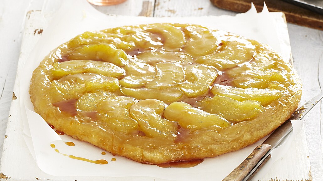 - Těsto rozválíme na plát silný asi 5 mm. Podle talíře, který má o trochu větší průměr než pánev, vykrojíme kruh. Těsto pak pomocí válečku přeneseme na jablka naskládaná v pánvi a a přitiskneme k okrajům.