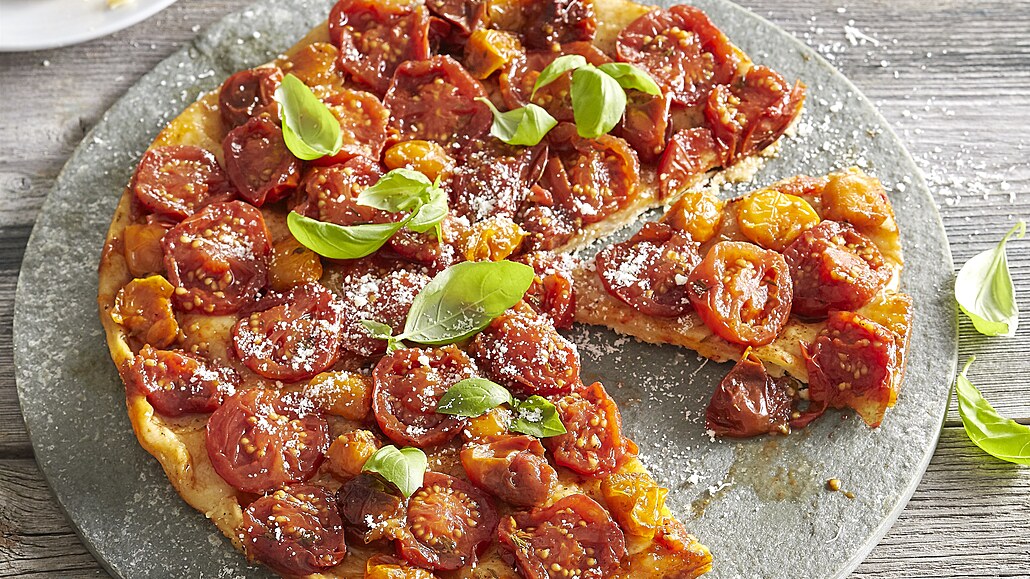 - Vypracujeme těsto, zabalíme do fólie a necháme 30 minut v lednici odležet. V pánvi rozehřejeme máslo s olejem. Vložíme přepůlená rajčata řeznou stranou nahoru včetně skrojených cherry rajčat.