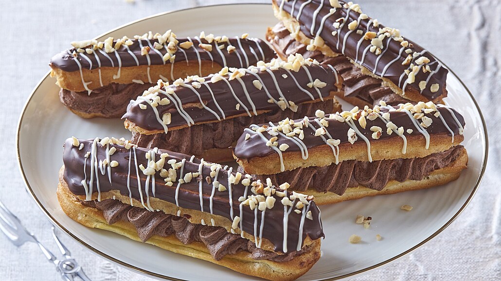 - Poté je podélně rozpůlíme, vrchní části potáhneme rozpuštěnou tmavou polevou, přestříkáme bílou polevou a posypeme oříšky. Necháme zatuhnout. Čokoládovou smetanu vyšleháme dotuha a naplníme jí připravené korpusy.