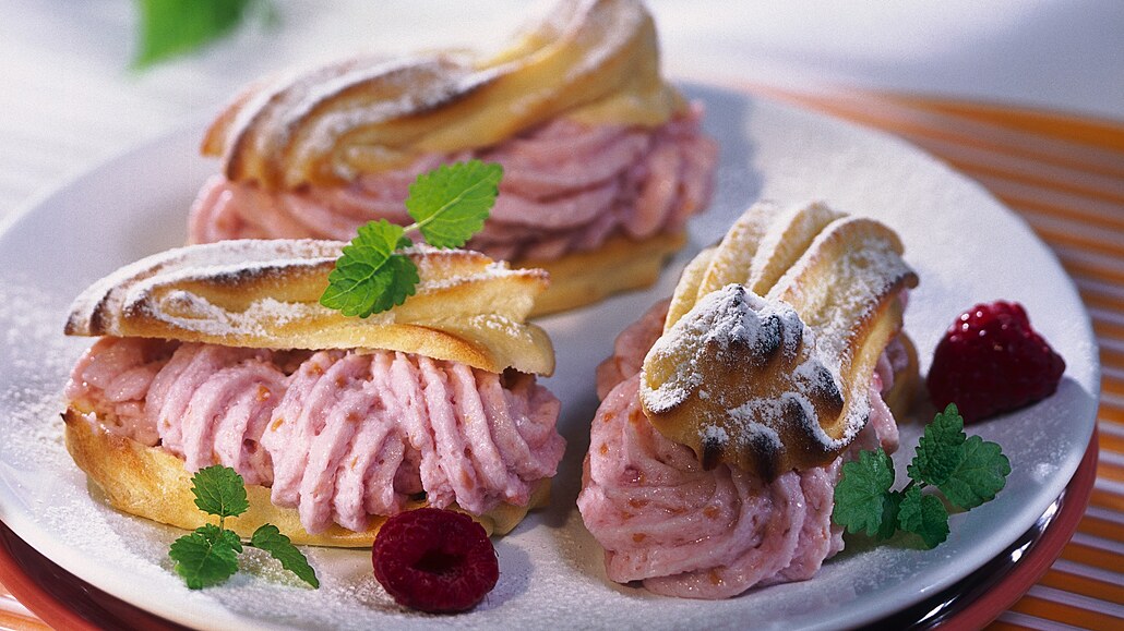 - Želatinu dáme nabobtnat do vody a pak ji zahřejeme asi na 60 °C, aby se rozpustila. Maliny (trochu si necháme na ozdobu) rozmačkáme na kaši a smícháme s moučkovým cukrem. Želatinu poté vmícháme do malinové kaše a vložíme na 30 minut do chladu. Smetanu spolu s vanilkovým cukrem ušleháme a smícháme ji s malinovou kaší. Směsí naplníme cukrářský sáček a nsstříkáme ji na spodní díly banánků. Banánky přiklopíme horním dílem a pocukrujeme. Podáváme ozdobené celými malinami a lístky máty.