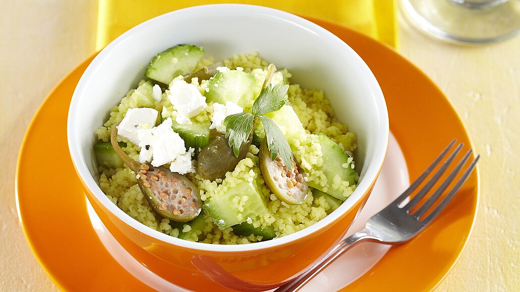 - Kousky okurky v míse smícháme s olivovým olejem, citronovou šťávou, medem a špetkou pepře. Přidáme nabobtnaný kuskus a pokrájenou petržel a promícháme. Salát posypeme kousky sýra a nasekanými kapary.