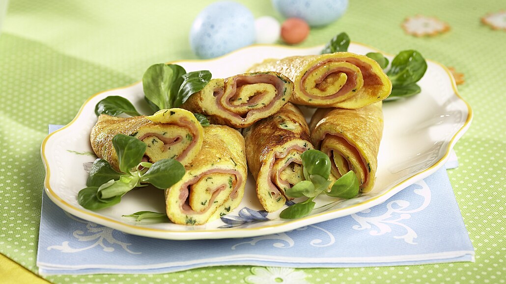 - Hotové omeletky stočíme, necháme 1 minutu odpočinout a pak je rozpůlíme. Rozdělíme je na talíře, ozdobíme polníčkem a podáváme.