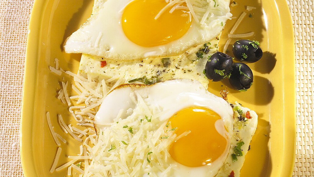 - Na oleji připravíme klasická sázená vejce, každé položíme na plátek opečeného tvarohu, posypeme parmazánem a na talířku doplníme olivami.