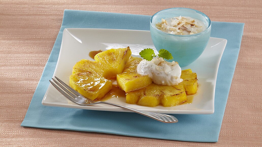 - Ananas oloupeme a podélně rozřízneme. Příčně ho nakrájíme na silnější plátky. Z každého kousku odřízneme zdřevnatělý střed. Ananas obalíme v krupicovém cukru a zvolna opečeme na másle v pánvi. Podáváme ho pokapaný medovým sirupem a s kokosovým krémem.