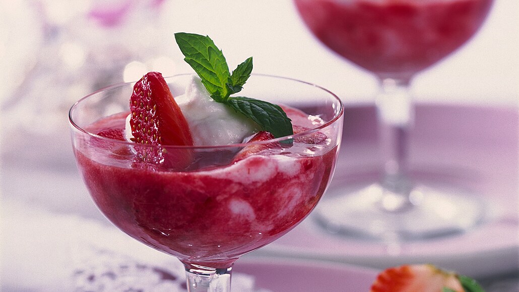 - K jahodovému pyré přidáme 3 lžíce zakysané smetany a lehce promícháme, aby se nám vytvořila mramorová struktura. Směs rozdělíme do skleniček, ozdobíme zbylou smetanou, kousky jahod a lístkem máty nebo meduňky.