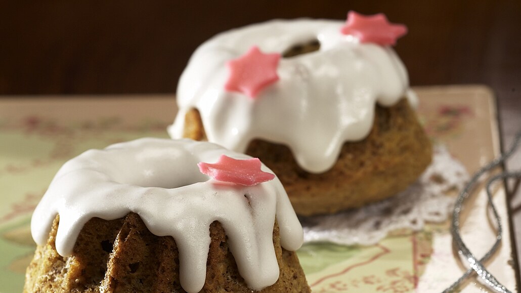 - Moučkový cukr smícháme s citronovou šťávou a 4 lžícemi horké vody. Mícháme tak dlouho, až vznikne hladká lesklá poleva. Povrch bábovek polijeme polevou (měla by stékat do tvaru rampouchů) a ozdobíme hvězdičkami, vykrájenými z růžově obarvené marcipánové hmoty.