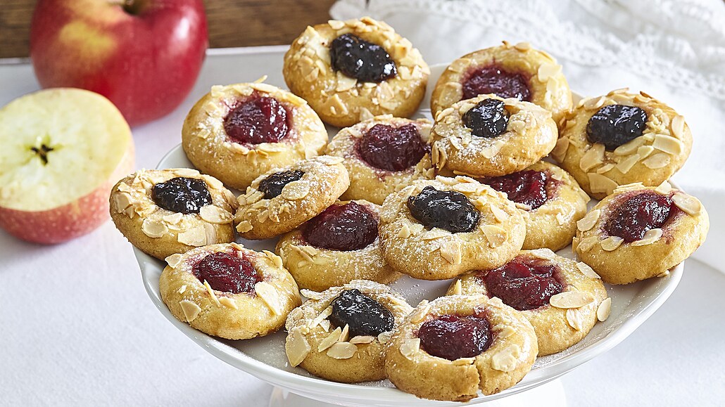 - Povrch koláčků potřeme zbylým rozšlehaným žloutkem se lžičkou vody a posypeme nahrubo rozdrcenými plátky mandlí. Pečeme v troubě předehřáté na 200 °C asi 15 minut dozlatova. Koláčky necháme vychladnout. Poté polovinu z nich naplníme džemem a zbylé povidly. Před podáváním je lehce pocukrujeme.