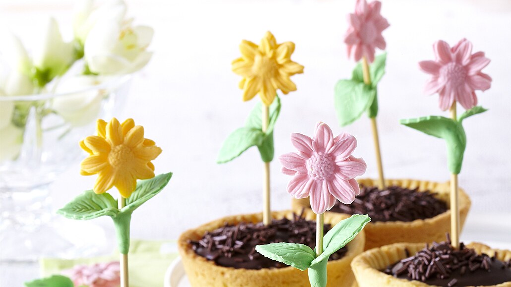 - Čokoládu s tukem a kakaem rozpustíme v horké vodní lázni. Polevou potřeme povrch náplně a posypeme čokoládovou rýží. Ořechové košíčky můžeme dozdobit kytičkami, které vymodelujeme z obarvené marcipánové hmoty a připevníme je na špejle.