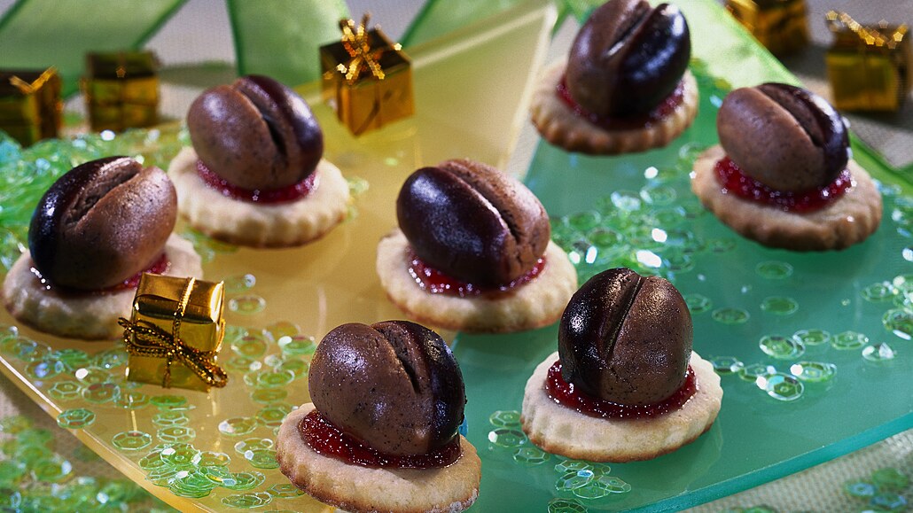- Na pomoučněném vále z těsta vyválíme tenkou placku. Tvořítkem z ní vykrájíme malé oválky, které přendáme na plech a v rozehřáté troubě při 180°C upečeme. Po upečení necháme vychladnout a potřeme je marmeládou.