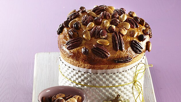 - Povrch potřeme rozšlehaným bílkem a dozdobíme zbylými mandlemi, ořechy a oříšky. Znovu potřeme bílkem. Pečeme ve vyhřáté troubě při 180 °C asi 20 minut. Pak teplotu snížíme na 160 °C a dopékáme dalších 20 minut.