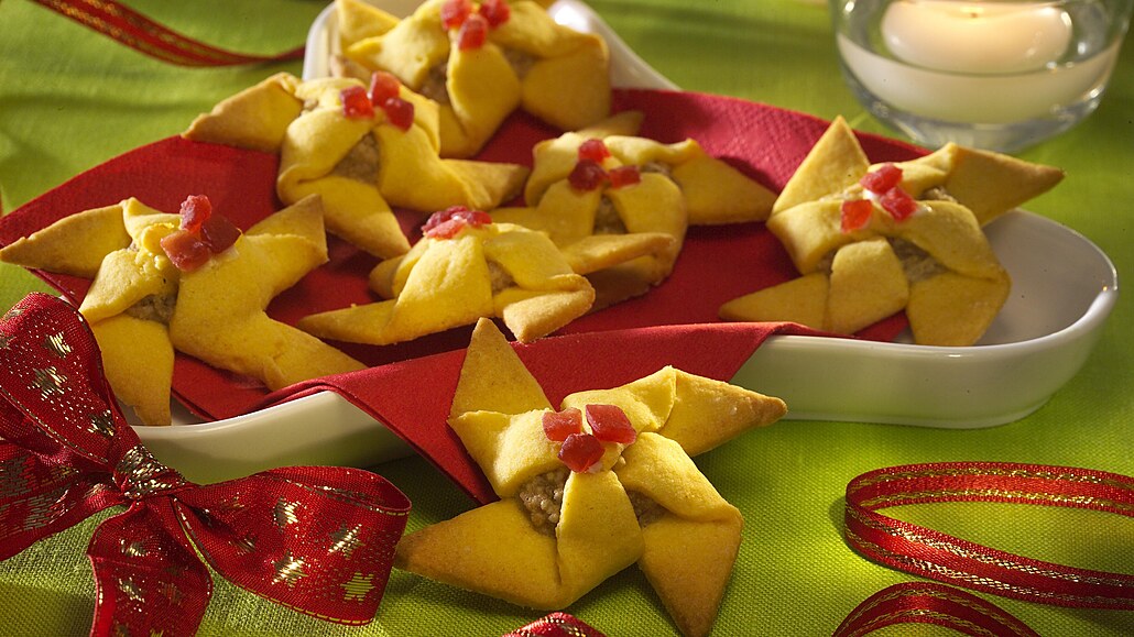 - Odpočinuté těsto rozválíme na plát silný 2 mm a rozkrájíme na čtverce 6x6 cm. Do středu každého čtverce dáme lžičkou ořechovou náplň a rohy čtverců rádýlkem nakrojíme. Cípy složíme do tvaru větrníčků, uprostřed mírně přitiskneme, aby se neotevíraly. Střed můžeme ozdobit kandovaným ovocem. Pečeme v předehřáté troubě při 180°C asi 12 minut. Po upečení necháme vychladnout a před podáváním pocukrujeme.