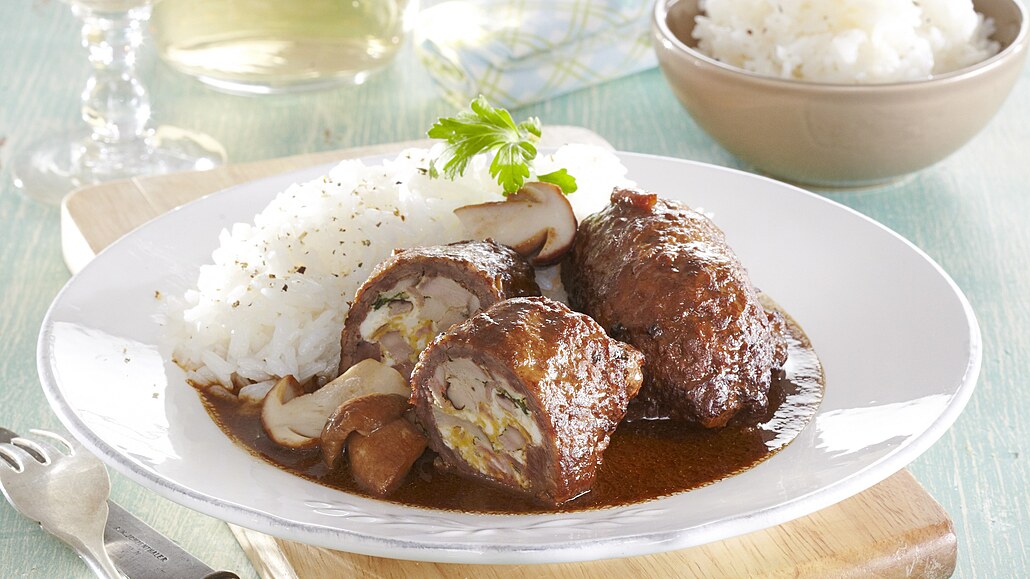 - Hovězí plátky omyjeme, osušíme a naklepeme. Osolíme, opepříme, rozdělíme na ně houbovou směs a pečlivě zabalíme. Závitky sepneme párátkem.