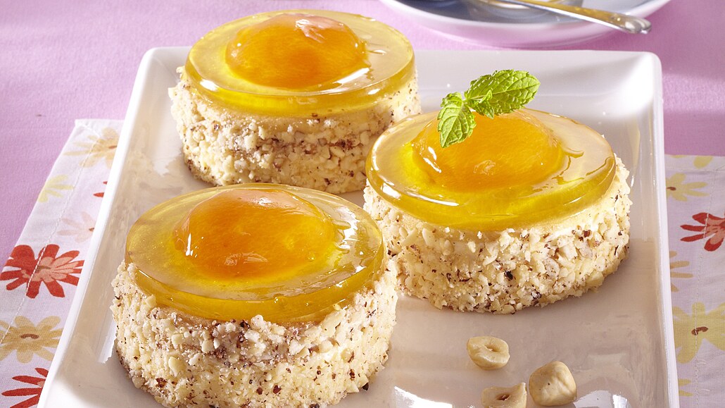 - Na povrch položíme půlku kompotové meruňky a potřeme dortovým želé, které připravíme podle návodu na obalu. Necháme ztuhnout a odležet asi 2 hodiny v chladničce.