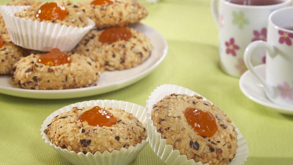 - Kuličky rozložíme na plech vyložený pečicím papírem a mírně stlačíme. Do středu každé z nich uděláme obráceným koncem vařečky důlek. V troubě při 180 not°C pečeme asi 15 minut.