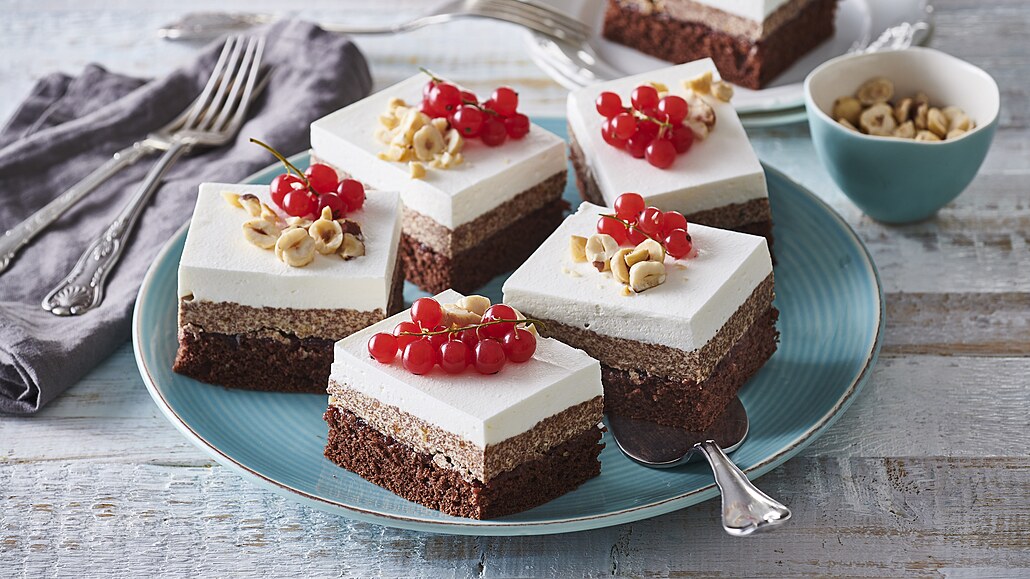 - Čokoládový plát potřeme džemem a připraveným krémem. Řez necháme zatuhnout asi 120 minut v chladničce. Poté na náplň rozetřeme dotuha vyšlehanou smetanu. Moučník nakrájíme na porce a ozdobíme nasekanými oříšky a rozmrazeným rybízem.