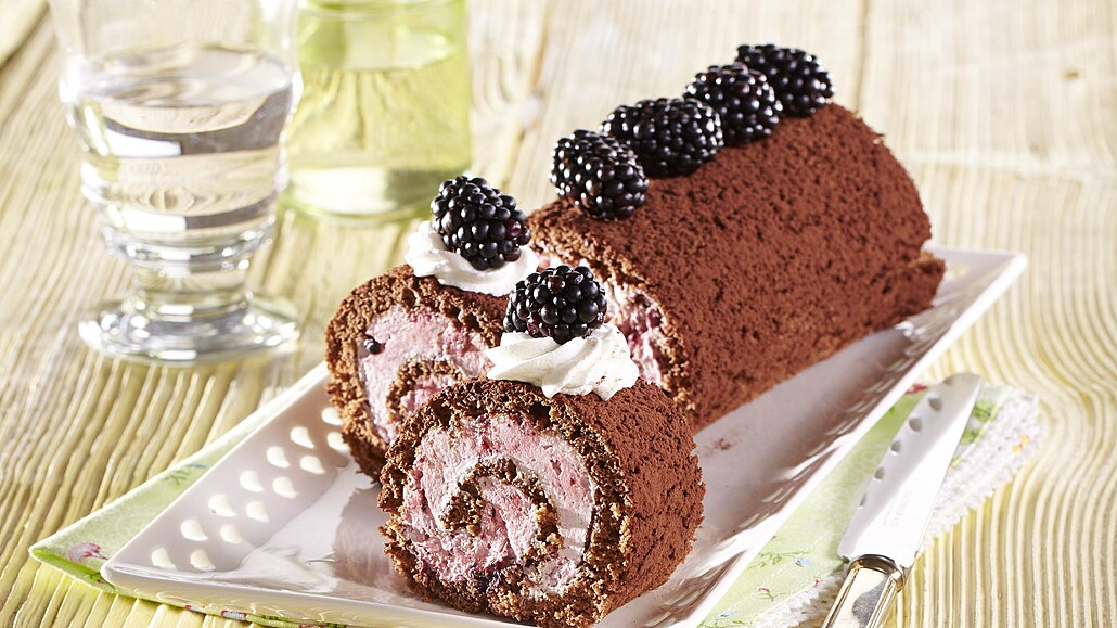 - Korpus položíme na čistý pečicí papír. Rozetřeme náplň a pomocí papíru stočíme do rolády. Necháme v chladničce ztuhnout. Pak roládu vybalíme z papíru a povrch posypeme kakaem. Nakonec ji ozdobíme šlehačkou a ostružinami.