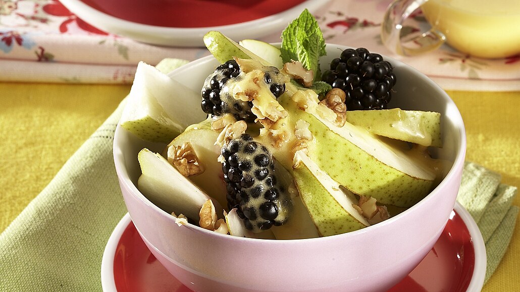 - Všechno ovoce vložíme do mísy a zlehka promícháme. Salát rozdělíme do mističek. Jednotlivé porce přelijeme vinnou omáčkou a posypeme sekanými ořechy. Navrch je můžeme dozdobit lístečky máty.