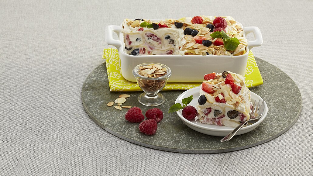- Na vrstvu těstovin rozetřeme část zbylého krému a poklademe ho dalšími naplněnými cannellonami. Nakonec je potřeme zbytkem krému a posypeme opraženými plátky mandlí. Na závěr těstoviny poklademe zbylým ovocem a necháme ztuhnout v chladničce alespoň 3 hodiny. Dozdobíme meduňkou a podáváme.