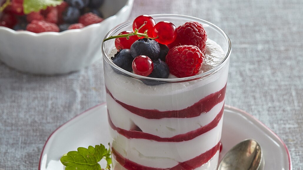 - Z mléka, cukru a pudinkového prášku uvaříme hustý krém, který necháme za stálého míchání vychladnout. Pak rozšleháme robotem, přidáme rum a mascarpone. Vyšleháme hladký krém, který naplníme do cukrářského sáčku s hladkou trubičkou. Do skleniček střídavě plníme krém a pyré z malin. Povrch skleniček ozdobíme očištěným ovocem.