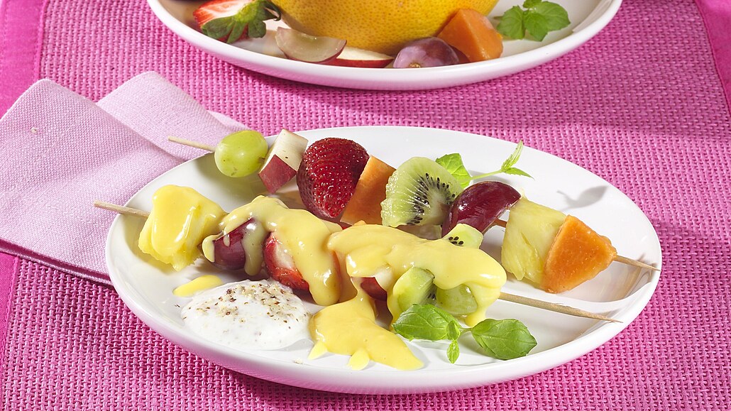 - Kousky ovoce střídavě navlékáme na špejle. Barevné špízky pak zapíchneme do omytého grepu. Podáváme s oběma sladkými omáčkami.
