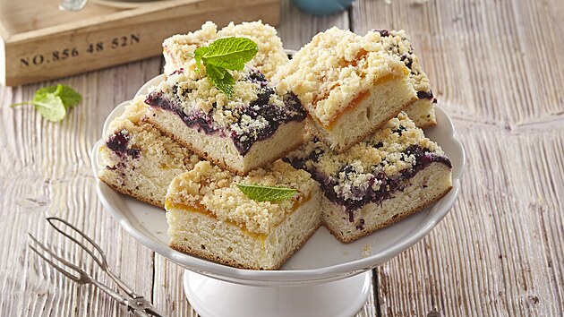 - V míse propracujeme mouku s cukrem a máslem na drobenku. Na těsto rovnoměrně rozložíme vybrané ovoce a posypeme drobenkou. Pečeme ve vyhřáté troubě při 180 °C asi 50 minut. Po upečení necháme vychladnout a poté krájíme na kostky.