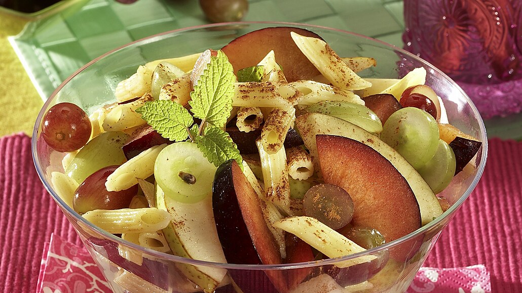 - Ovoce poprášíme cukrem se skořicí a promícháme. Nakonec přidáme těstoviny. Salát pokapame olejem, ozdobíme meduňkou a podáváme.