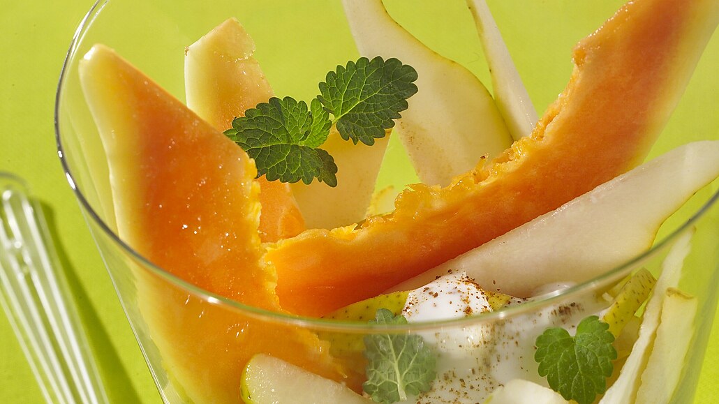- Ovoce narovnáme do rovné misky nebo sklenice a doplníme jogurtem se skořicí, popřípadě i umělým sladidlem. Nakonec přidáme lístky máty nebo meduňky.