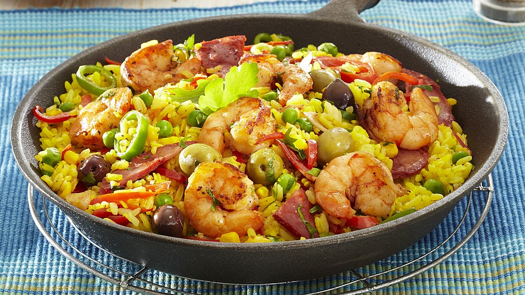 - Když je rýže téměř měkká, přidáme do pánve olivy, hrášek a krevety. Paellu dodusíme a odstavíme.