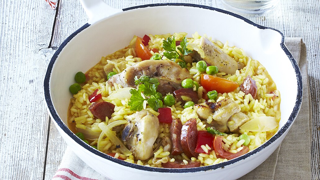 - Papriku a rajčata očistíme a nakrájíme na dílky. Zeleninu společně s hráškem poté přidáme k rýži a dovaříme doměkka. Hotovou paellu posypeme čerstvě nasekanou petrželkou.