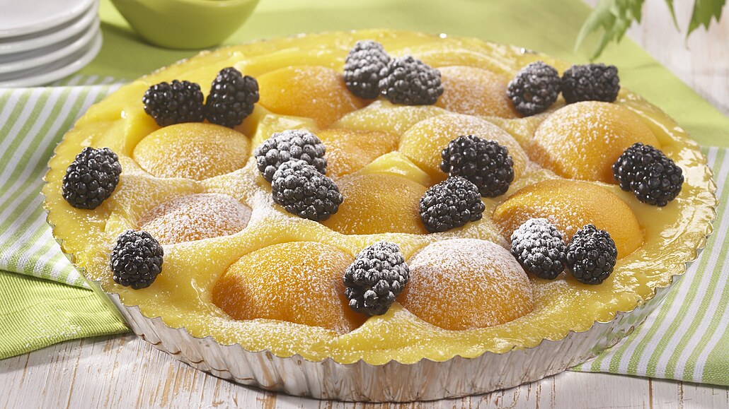 - Dort dozdobíme půlkami broskví a ostružinami. V chladu ho necháme zatuhnout. Před podáváním ho pocukrujeme.