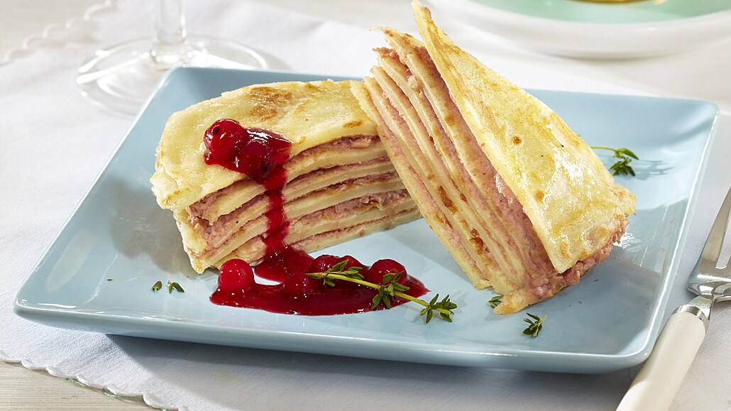 - Pět palačinek potřeme krémem a sesadíme je dohromady. Navrch přitiskneme zbylou omeletu. Dort necháme v chladu zatuhnout. Před podáváním ho nakrájíme na kousky, které na talíři doplníme rybízovým dipem.