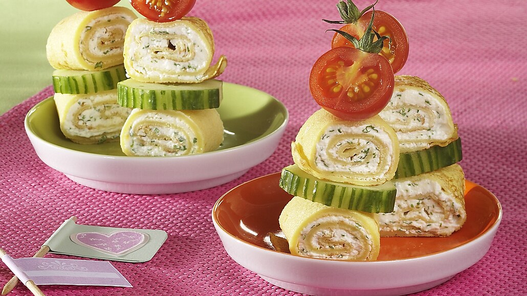 - Palačinky s okurkou napíchneme střídavě na párátka nebo špízky. Hotové věžičky dozdobíme rozpůlenými rajčátky a dáme na chvíli do chladničky.