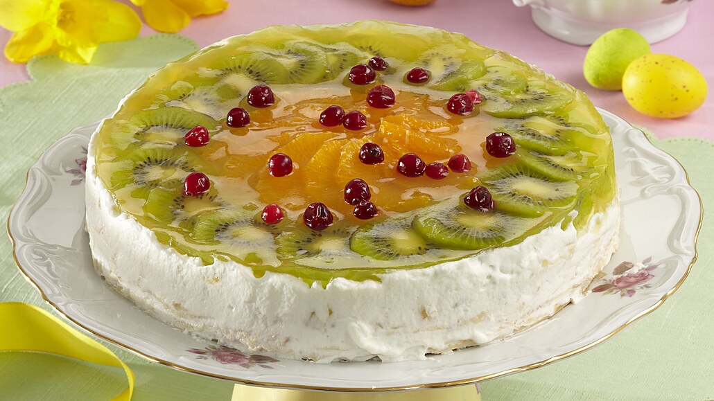 - Na povrch dortu ozdobně rozložíme plátky kiwi a mandarinek. Potom dort obtočíme pruhem alobalu a dáme vychladit. Podle návodu připravíme dortové želé a postupně jím po malých částech přelíváme nejprve okraje dortu. Když okraje zatuhnou, přelijeme ovoce zbylým želé. Dort dáme ztuhnout , potom odstraníme alobal a dort po stranách potřeme dotuha vyšlehanou šlehačkou s cukrem.