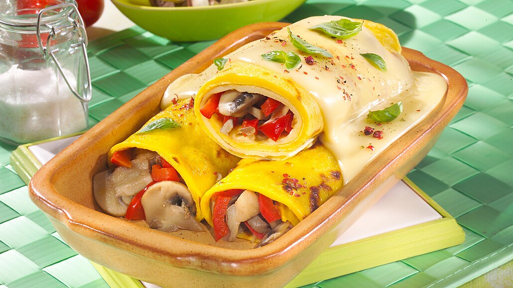 - Palačinky potřeme žampionovou směsí a stočíme. Naplněné palačinky naskládáme do máslem vymazané zapékací misky. Povrch palačinek posypeme nastrouhaným sýrem a zapečeme v předehřáté troubě při 180 °C asi 15 minut.