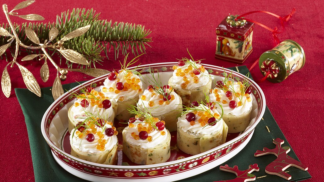 - Pak palačinky nakrájíme na silnější kolečka. Zbylou sýrovou směs bez pažitky dáme do cukrářského sáčku a nastříkáme na kolečka. Ozdobíme kaviárem a koprem.