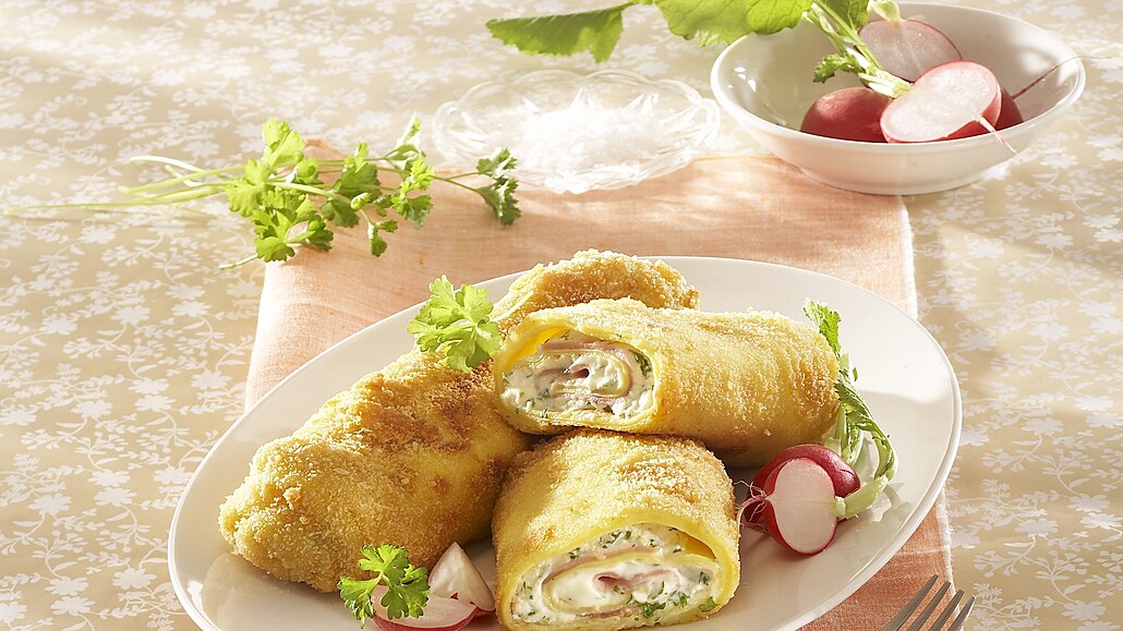 - V misce vyšleháme z vejce, mouky a mléka řídké těstíčko, které lehce osolíme. Strouhanku prosijeme na talíř. Palačinky obalujeme nejprve v těstíčku a pak ve strouhance. V pánvi rozehřejeme olej, palačinky na něm ze všech stran opečeme a necháme okapat. Na talířích ozdobíme bylinkami a čerstvou zeleninou.