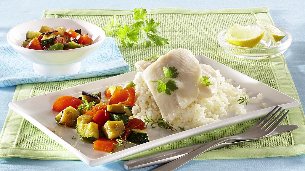 - Alobal dobře uzavřeme a položíme na plech nebo pekáček. Pečeme ve vyhřáté troubě při 170 °C asi 20 minut. Pak alobal rozbalíme a rybu přendáme na talíře. Přidáme rýži a dušenou zeleninu (rýži a zeleninu můžeme promíchat). Ozdobíme bylinkami.